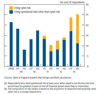The report states In the past six months, several UK banks and financial market infrastructures have experienced cyber attacks, some of which have disrupted services. While losses have been small relative to UK banks’ operational risk capital requirements, they have revealed vulnerabilities. If these vulnerabilities were exploited to disrupt services, then the cost to the financial system could be significant and borne by a large number of institutions