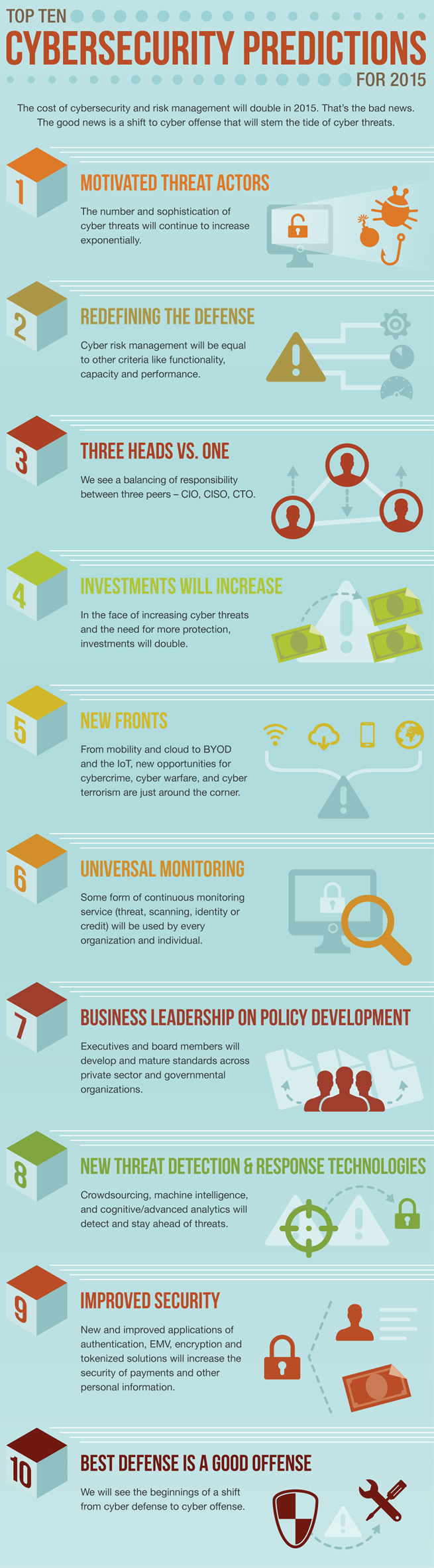 Fuelled by cybercrime, cyber warfare, and cyber terrorism, the cost of cybersecurity and risk management will double in 2015. That’s the bad news. The good news is there will be a shift to cyber offense that will begin to stem the tide of cyber threats.